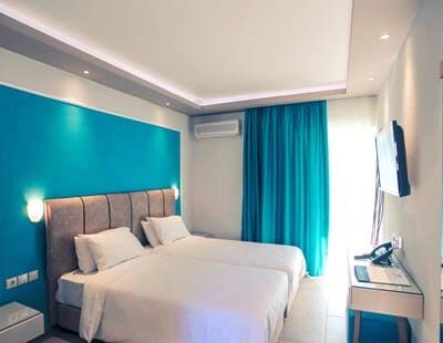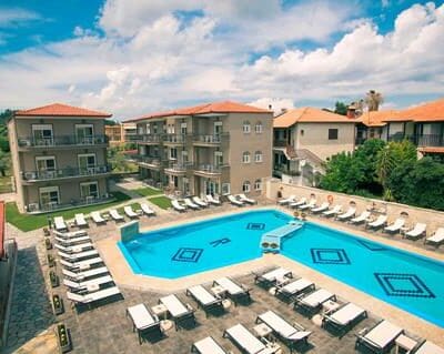 Royal Hotel and Suites betekent gegarandeerd een fijne vakantie. De zon komt je tegemoet wanneer je de gordijnen 's ochtends opent. Na een lekker ontbijt sta je al in 5 minuten met je voeten in het zand. De met blauwe vlag bekroonde kristalheldere zee nodigt je uit om een koele duik te nemen. Drink een glas ouzo in één van de bars langs het strand.