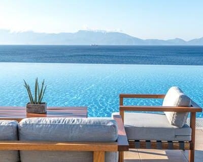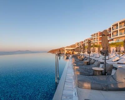 Luxueus 5 sterren hotel, Mooie en ruime infinity pool, Comfortabel ingerichte kamers, Loopafstand van het strand, Modern hotel in Griekse stijl, Veel welnessfaciliteiten & inclusief transfers.