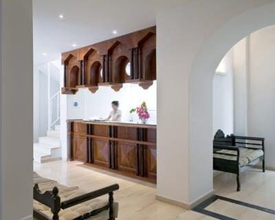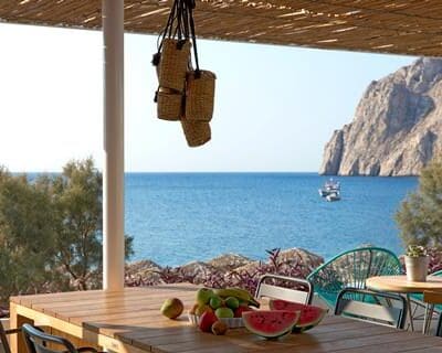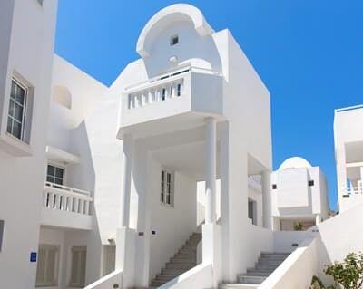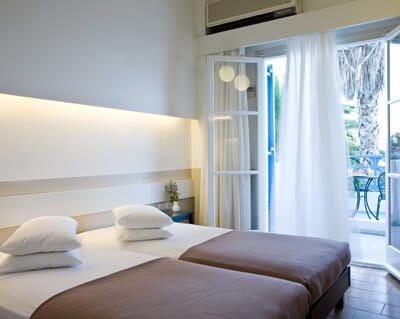 Uit bed zo de boulevard op, En zó op het strand, Grootste zwembad van Kamari, Bijkomen tussen palmbomen, Met restaurant aan zee, Vriendelijke service & inclusief transfers.