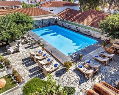 Eenvoudig hotel in Skopelos-stad, Wandel naar de haven, Terrasje pakken in het centrum, Afkoelen in het zwembad, Hartelijke Griekse gastvrijheid, Kleinschalig en comfortabel & inclusief transfers.