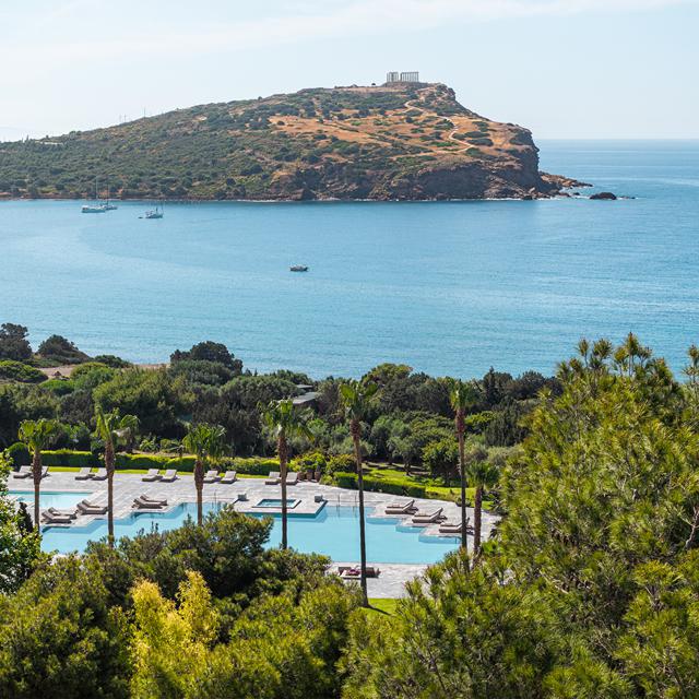 Het uitzicht is werkelijke adembenemend. Je kijkt uit over de baai en de tempel van Poseidon. Op het privéstrand kun je heerlijk zonnebaden of een duik nemen in de zee. De luxe spa neemt een prominente plek in, midden in een prachtige tuin vol planten en bomen. Hier ervaar je een uniek gevoel van ontspanning mede door de weldadige behandelingen op basis van Griekse kruiden en bloemen. Op een warme dag biedt het grote zwembad verkoeling en is het fantastisch om te genieten van het verrassende uitzicht.