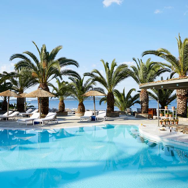 Het super-de-luxe Hotel Eagles Palace wordt omringd door palm- en olijfbomen en kleurige bloemen. Het strand met een kristalheldere zee ligt pal voor de deur en deze tropische omgeving vormt een idyllisch plaatje.