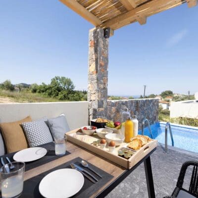 De rust, het zonnetje boven je hoofd en het groenblauwe kleurenpalet waar je op uitkijkt, brengen je in een heerlijke vakantiemodus. Overigens draagt niet alleen de omgeving hieraan bij, maar ook de vier comfortabele villa’s. Deze zijn ruim, ingericht met zachte aardetinten en voorzien van een grote boxspring. Ook hebben ze een keuken en een fijn terras mét eigen zwembad. Hoe luxe is dat? Pak er een drankje bij, zet je favoriete muziek op en strijk neer op het ligbed. Wedden dat je hier voorlopig niet meer weg wilt? Heb je wel zin om de deur uit te gaan? Dan is er in Zuid-Kassandra ook genoeg te doen: ontdek bijvoorbeeld nederzetting Paliouri, het mooie en brede zandstrand Chrousso Beach of één van de vele (vis)tavernes. Hoe dan ook, je gaat hier een fantastische tijd tegemoet!
