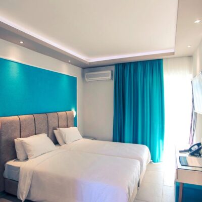Royal Hotel and Suites betekent gegarandeerd een fijne vakantie. De zon komt je tegemoet wanneer je de gordijnen 's ochtends opent. Na een lekker ontbijt sta je al in 5 minuten met je voeten in het zand. De met blauwe vlag bekroonde kristalheldere zee nodigt je uit om een koele duik te nemen. Drink een glas ouzo in één van de bars langs het strand.