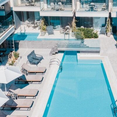 De suites van Serenity Suites zijn een feestje om in te verblijven. Ze zijn strak ingericht met moderne details en bieden allerlei luxe faciliteiten. Bovendien liggen ze om het mooi aangelegde terras met zwembad heen, wat het geheel een knusse sfeer geeft. Op één van de ligbedden kun je dan ook heel wat uurtjes heerlijk luieren in het zonnetje. Sluit je middag ontspannen af op je balkon met een goed glas wijn en droom alvast even weg over de dag van morgen…