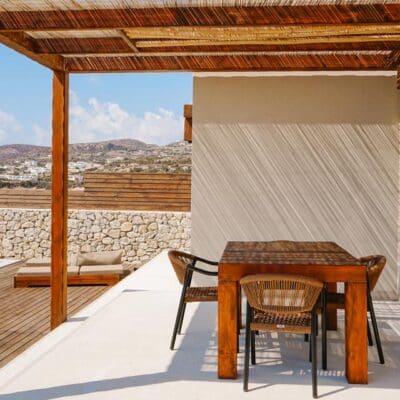 AMMOO is ontworpen voor twee: adults only, dus perfect voor een romantisch uitje met z'n tweeën. De suites zijn heerlijk ruim en bieden naast privacy ook fijne extra's, zoals een terras met buitenlounge, indoor én outdoor douches, en zelfs wat slimme workout gear voor wie tussen het luieren door nog wat energie kwijt wil. En een fijne verrassing: bij aankomst staat er een volle koelkast klaar, gevuld met lokale lekkernijen, snacks en drankjes. De ligging aan de rustige zuidkust van Karpathos – vlak bij het strand en charmante dorpjes – maakt het helemaal af. Hier draait alles om ontspanning op niveau, met oog voor detail en een uitzicht waar je stil van wordt.