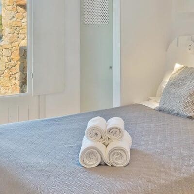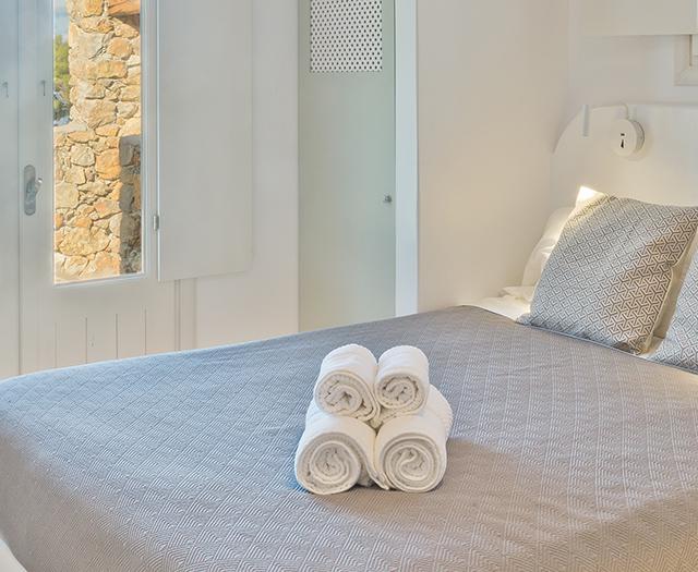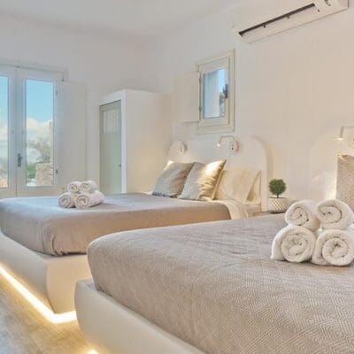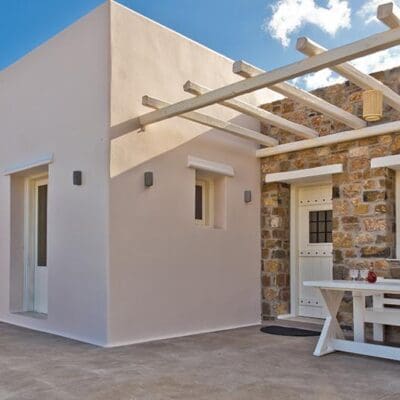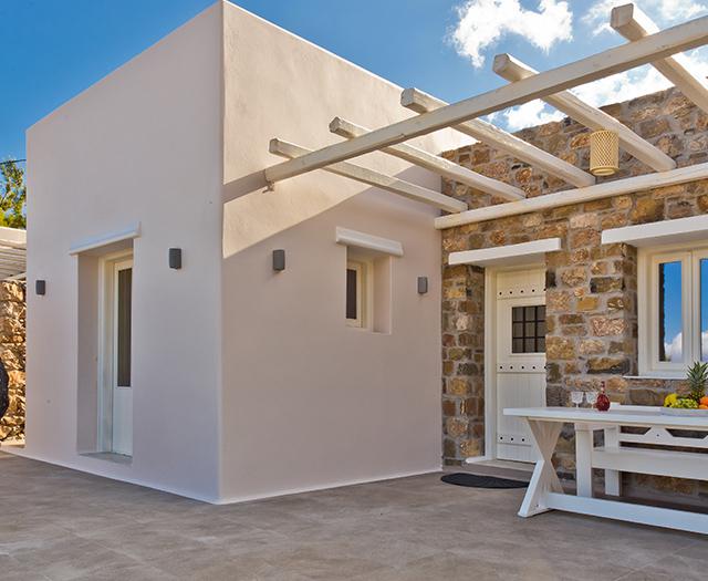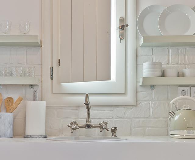 Na het doen van de boodschappen voor één van mijn favoriete Griekse gerechten, geniet ik nog even van het indrukwekkende uitzicht vanaf mijn eigen privézwembad met infinity pool. Een frisse plons en later trek ik me terug in het knusse witte keukentje. De frisse villa is één grote open ruimte, met als blikvanger een witte boog die je naar je slaapkamer brengt.