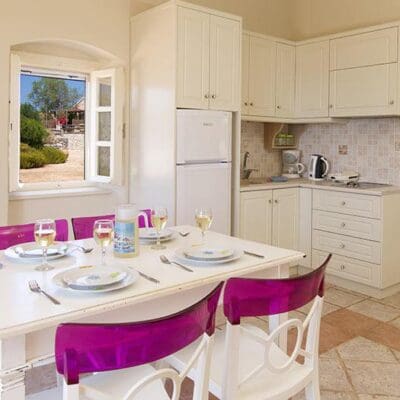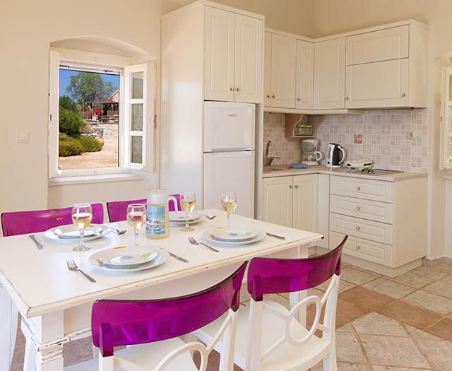 Als je op een van de mooiste plekjes van het eiland bent, gelegen op een heuvel, aan een bosrand en met de mooiste vergezichten op zee… Tja, dan kun je niet anders dan je realiseren hoe wonderschoon de kracht van Moeder Aarde is. Eigenaar Yiannis dacht: hier wil je toch elke dag wakker worden tijdens een vakantie op Kefalonia? Hij bouwde naast de eeuwenoude en beroemde dorsvloer vier kleine studio's en een villa en noemde het de Aloni Cottages. Gebouwd in de stijl van het eiland, met natuurlijke materialen en zo pittoresk als het maar kan. En verderop ligt zijn taverne, waar de houtoven de lekkerste Griekse maaltjes bereid met ingrediënten van het land.