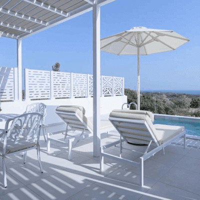 De Dionysos Suites op Kefalonia hebben mijn hart gestolen! Vanaf het dakterras van mijn suite heb ik een betoverend uitzicht over het azuurblauwe water van de Ionische Zee en alsof dat nog niet genoeg is, heb ik ook nog eens een privézwembad. Hier kom ik mijn tijd wel door!