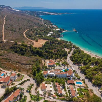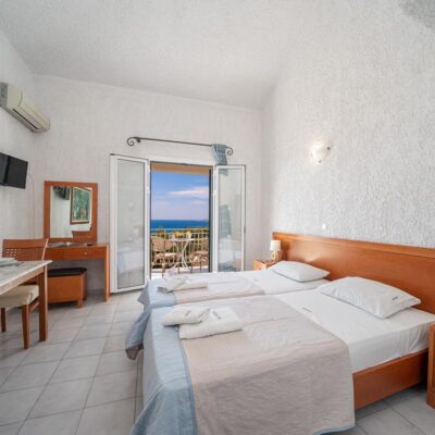 Voor wie houdt van rust en stilte, is dit resort de ideale bestemming. Gelegen op een heuvel biedt het een adembenemend uitzicht op zowel de bergen als de Middellandse Zee. Wil je toch de omgeving verkennen? In de buurt ligt het populaire Makris Gialos strand, bereikbaar via een korte wandeling. Ook de hoofdstad van het eiland is een aanrader, met verschillende wandelpaden die je naar hoger gelegen gebieden brengen. Voor een unieke ervaring bezoek je de haven, waar je vaak de beroemde Caretta Caretta schildpadden ziet. Na een actieve dag geniet je van heerlijke lokale (vis)gerechten en ontspan je in de tuin of bij het zwembad van het resort.