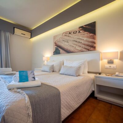 Supervriendelijk personeel, Kleinschalig complex, Net buiten Kos-stad, In een paar stappen op het strand, Heerlijk dobberen in het zwembad, Moderne, nette kamers & inclusief transfers.