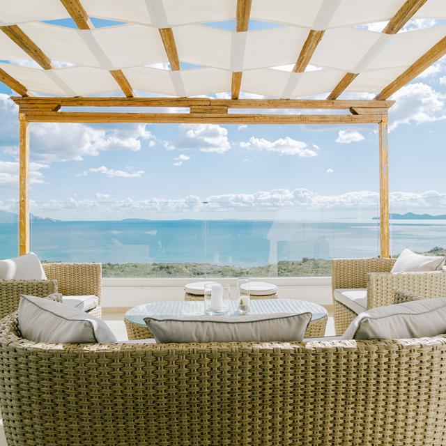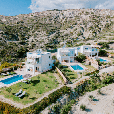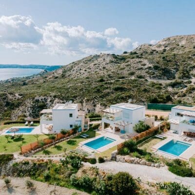Three Graces Villas bestaat uit drie identieke luxe villa's met elk twee slaapkamers en twee badkamers. De inrichting is smaakvol, met natuurlijke materialen en zachte aardetinten die perfect passen bij de serene omgeving. Iedere villa beschikt over een royale privézwembad met zonneterras en een weelderige tuin waar het heerlijk toeven is. Binnen vind je een romantisch bubbelbad dat uitnodigt tot ontspannen na een dag vol ontdekkingen. Voor wie actief wil blijven, is er een gym op het terrein. Het panoramische zeezicht, de rust van de locatie en de stijlvolle afwerking maken dit tot een van die zeldzame plekken waar je je meteen thuis voelt.