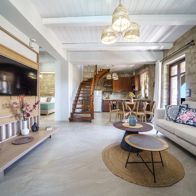 Ik sta arm in arm met de inwoners van het dorpje Kato Asites en dans de sirtaki. Na een dansrondje ga ik met Nikos aan tafel zitten. In gebrekkig Engels, en met behulp van handen-en-voeten-werk, vertelt hij me over de tradities en de kracht van dit zonnige eiland. 'Asion Lithos: ruimte, rust én traditie', lacht hij. Uiteraard laat ik me graag onderdompelen in de sfeer van dit eiland, dus de volgende ochtend sta ik bij het krieken van de dag bij hem voor de deur. Het hele verblijf bestaat uit meerdere villa's, gebouwd van traditioneel natuursteen en hout dat hier al eeuwen wordt gebruikt. De villa's zijn ingericht in een traditionele stijl, met comfort en gezelligheid. En dan bedenk ik me: ik wil nog veel meer over dit eiland te weten komen.