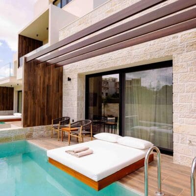 Privézwembad bij elke suite;Perfect voor gezinnen en stellen;Modern en stijlvol ingericht;Gezellige tavernes en cafés op loopafstand