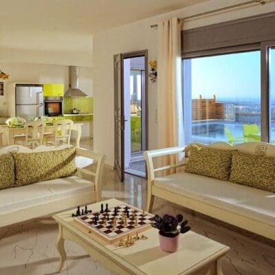 Na een autorit van niet meer dan een half uur, met de eindeloze Kretenzische zee aan mijn linkerhand en de prachtige ruwe hellingen aan mijn rechterhand, kom ik aan in het charmante dorpje Koutouloufari. Ik ga vandaag op bezoek bij een Griekse familie. Als ik het eerste koffietentje zie loop ik snel naar binnen en bestel een ijskoffie. Ik ga aan een tafeltje zitten en neem een slok van mijn koffie. “Waar kan ik Danae's Villas vinden?” vraag ik aan de barista. Ze loopt met me mee naar buiten en wijst richting de heuvel. “Rijd rechtdoor en sla daarna rechtsaf!” zegt ze. Ik bedank de vrouw en stap mijn autootje in.