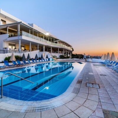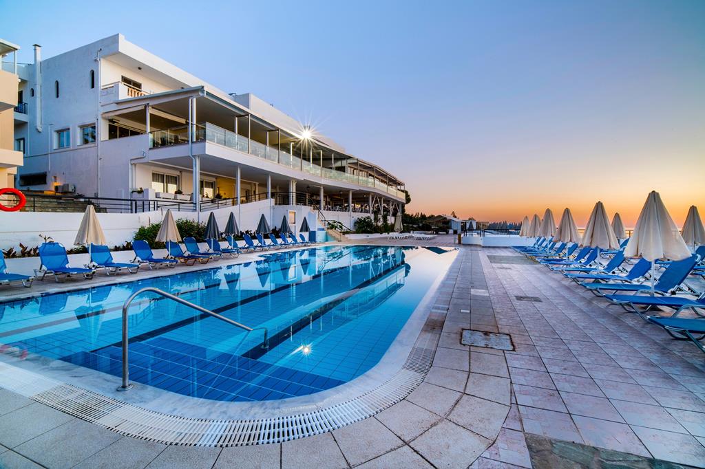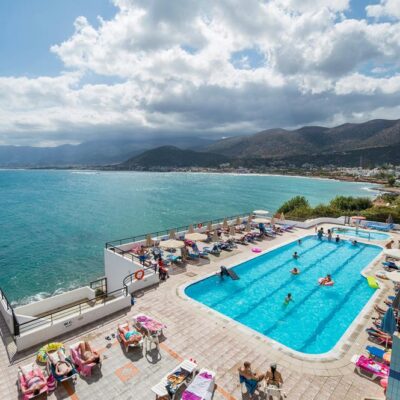 Lekker zonnen bij het zwembad, Een prettige locatie bij Stalis, Zo op het strand en centrum, Comfortabele kamers, Geniet van uitzicht op zee, Levendige omgeving & inclusief transfers.