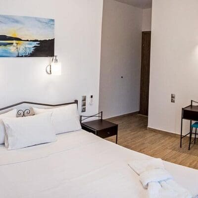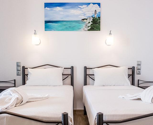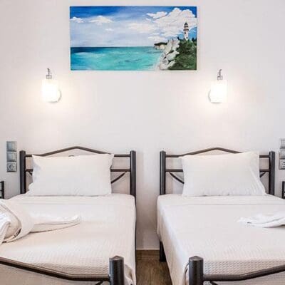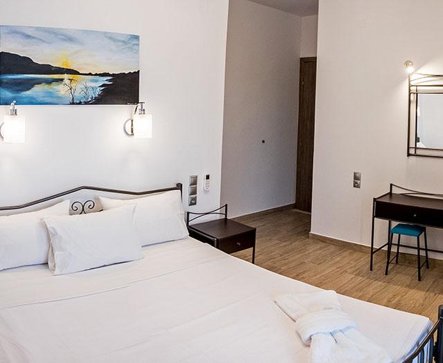 Wanneer ik de auto parkeer bij Amousso Beach Villas hoor ik opeens muziek: het zijn melodische en onmiskenbare Griekse klanken. Daar staat Stathis, met een apart uitziende gitaar in zijn hand. Een bouzouki, een traditioneel instrument, vertelt hij me later. Stathis is een professionele muzikant, maar hij had altijd de droom om samen met zijn vader een verblijf te bouwen op het eiland waar hij is opgegroeid. Met de jarenlange ervaring van George en de creativiteit van Stathis kan dit alleen maar een succes worden.