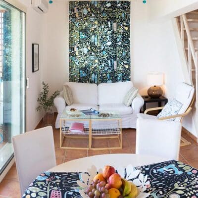 We stappen uit en ik kijk om me heen. De gekleurde villa's die ik zie worden gesierd door Franse ramen en brede balkons. Een paar meter verderop glinstert het lichtblauwe water van een zwembad in mijn ogen. Ik loop ernaartoe en word beloond met een magisch uitzicht op de Griekse zee. Naast het zwembad staat een tafeltje gedekt. Ik zucht. “Wat is het hier mooi! Zou er nog een plekje vrij zijn?” vraag ik Rena. Ze zegt dat ze haar tante zal inschakelen. En ik kan alleen maar duimen. Hier wil ik de komende dagen logeren…