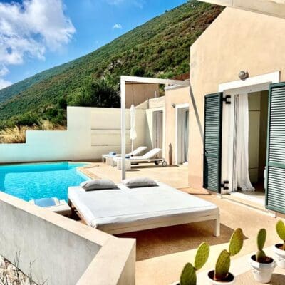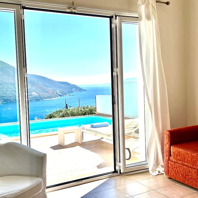 Het is alsof ik even helemaal alleen op de wereld ben. Vanaf het ruime terras van mijn villa kijk ik uit over het glooiende heuvellandschap van Lefkas, met de azuurblauwe zee die zich in de verte uitstrekt. Het privézwembad is een verfrissende uitnodiging, maar het uitzicht houdt me vast. Het lijkt wel alsof ik hier in mijn eentje de tijd kan vergeten, al weet ik dat het avontuur snel te vinden is. Binnen een paar minuten ben ik op de beste plek om te windsurfen of wandel ik naar een van de idyllische baaitjes. Alles klopt hier: de rust, het uitzicht, de vrijheid.