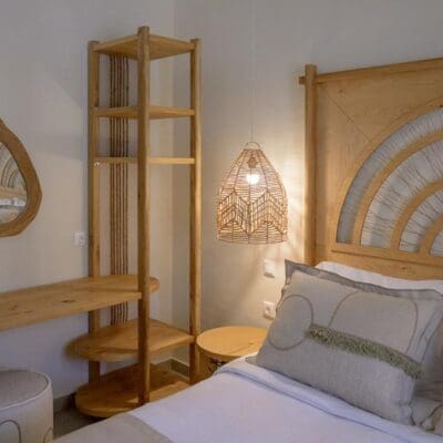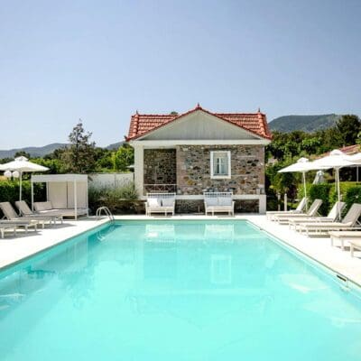 Ikies ligt net buiten het levendige stadje Molyvos, op een paar minuten van het strand, maar voelt alsof je in een geheim hoekje van Lesbos bent beland. De voormalige stallen zijn omgetoverd tot stijlvolle suites, met natuurlijke materialen, warme kleuren en een vleugje boho. Je kunt hier kiezen uit verschillende kamertypes, van een premium tweepersoonskamer tot een villa met privézwembad. De tuin is groen en weelderig, het uitzicht rustgevend, en de sfeer? Die is precies goed. Of je nu yoga wil doen, ontspannen op je ligbed, of wegdromen met een boek: hier kom je écht tot rust.
