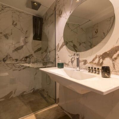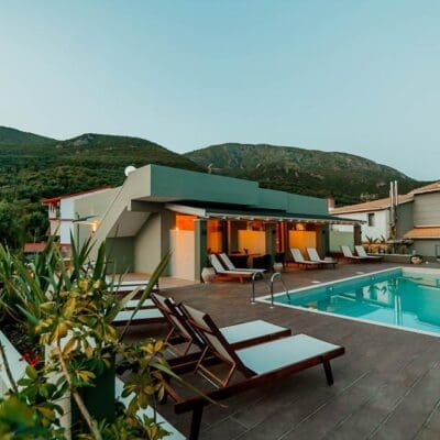 De eigenaren hebben het pand vorig jaar gekocht en volledig gerenoveerd. De vader was aannemer van beroep en deed veel van de renovaties zelf. Hij is gespecialiseerd in metselwerk, dus je zult zijn steenwerk op sommige binnen- en buitenmuren zien. De familie bestaat uit Griekse Albanezen – van Griekse afkomst, maar woonden vele jaren in Albanië voordat ze terugkwamen om zich in Griekenland te vestigen. En tja, dit plekje op Parga is geen slechte keuze. Hier wil iedereen wel blijven.