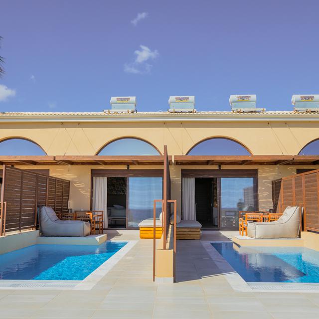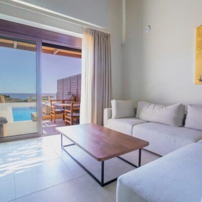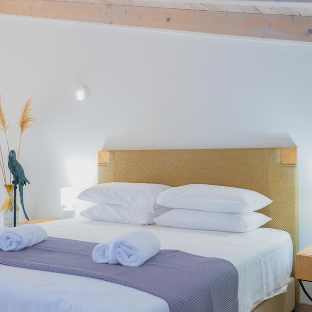 De appartementen zijn stijlvol ingericht en voorzien van alle comfort, met een privéterras waar je uitkijkt over het glooiende landschap en de diepblauwe zee. Overdag kun je relaxen bij het zwembad of de omgeving verkennen, met sfeervolle dorpjes en ongerepte strandjes binnen handbereik. 's Avonds brengt de zachte verlichting een magische sfeer, terwijl een zwoele bries je eraan herinnert dat je je op een van de mooiste plekken van Griekenland bevindt.