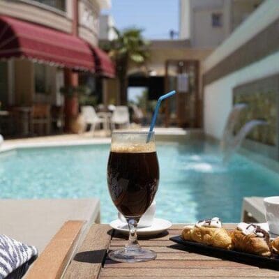 Het hotel bestaat uit twee gebouwen – Evilion en Stilvi – die samen één kleinschalig complex vormen. De kamers zijn ruim en bieden je een balkon met uitzicht op de tuin, zee of de berg Olympus. De stijl is modern maar warm, en boek je de Honeymoonsuite dan kun je ’s avonds onder de sterren in je eigen hot tub bubbelen.