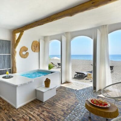 Terwijl ik door het charmante dorpje Ancient Olympia rijd, voel ik meteen de serene sfeer die deze plek uitstraalt. De groene heuvels en olijfbomen omringen me, en zodra ik de oprijlaan van Olympa Suites op draai, weet ik dat dit een bijzondere plek is. De suites liggen direct aan het strand, terwijl op de achtergrond de mythische berg Olympus oprijst. De combinatie van zee en bergen zorgt voor een unieke sfeer van rust en reflectie. Mijn suite straalt luxe en comfort uit, met een ruim privéterras waar een jacuzzi op me wacht. Ik laat me in het warme water zakken en kijk uit over de eindeloze zee… wat een ultiem ontspannen gevoel.