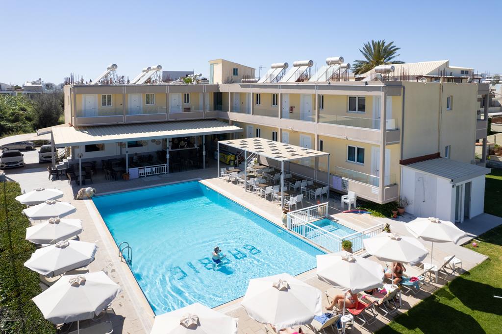 Fijn: nette appartementen, Griekse snacks met liefde gemaakt, Service, vriendelijke eigenaren, Afkoelen in het ruime zwembad, Een speeltuin voor de kleintjes & inclusief transfers.