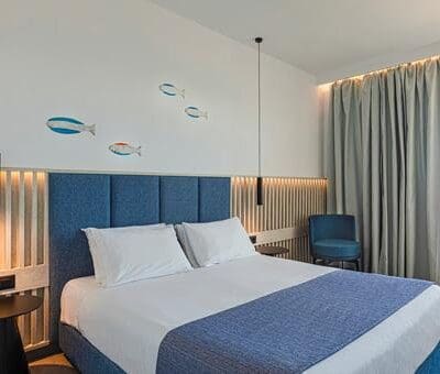 Hier kan je er niet om heen, blauw is hier het toverwoord. Niet alleen sta je bij binnenkomst oog in oog met een reuze vissenkom, de gastvrijheid voel je hier meteen. Het gezellige hotel ligt daarnaast direct aan een zandstrand en dus aan zee.