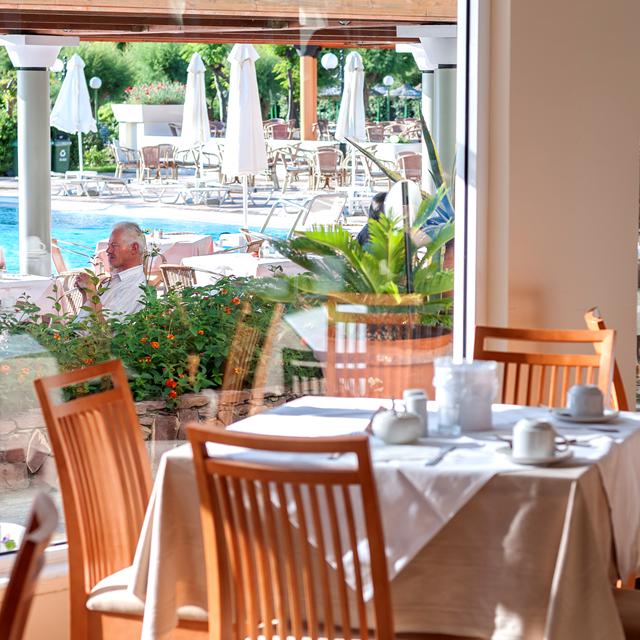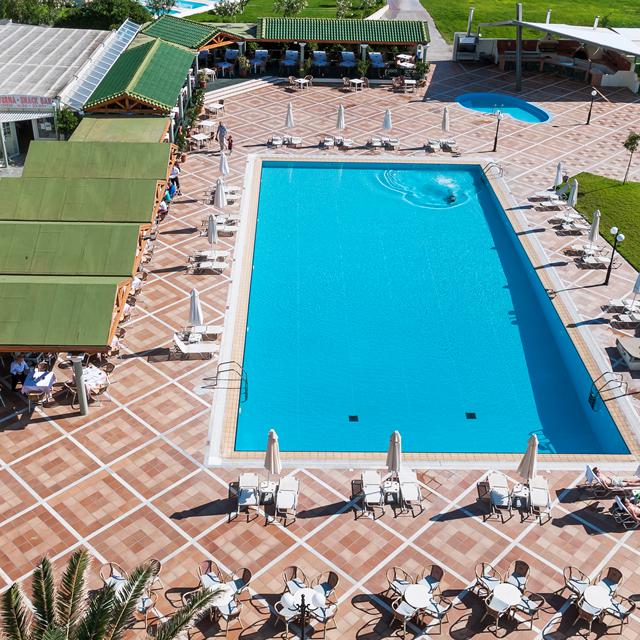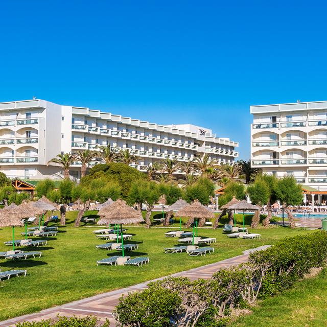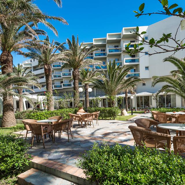 Het hotel wordt omgeven door tropische palmbomen en voor het zwembad ligt een ruime ligweide waar zonnebedjes over verspreid staan. Ideaal voor eventuele kinderen is het speeltuintje dat ook in deze weide ligt, zo kan verkoeling in het kinderbadje worden afgewisseld met spelen op het droge.
