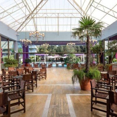 Het strand ligt op loopafstand en is een kiezelstrand met ligbedden en parasols (tegen betaling). In de tuin kun je ontspannen onder de palmbomen of een drankje bestellen bij de bar. Verder is er een restaurant met gevarieerde maaltijden.