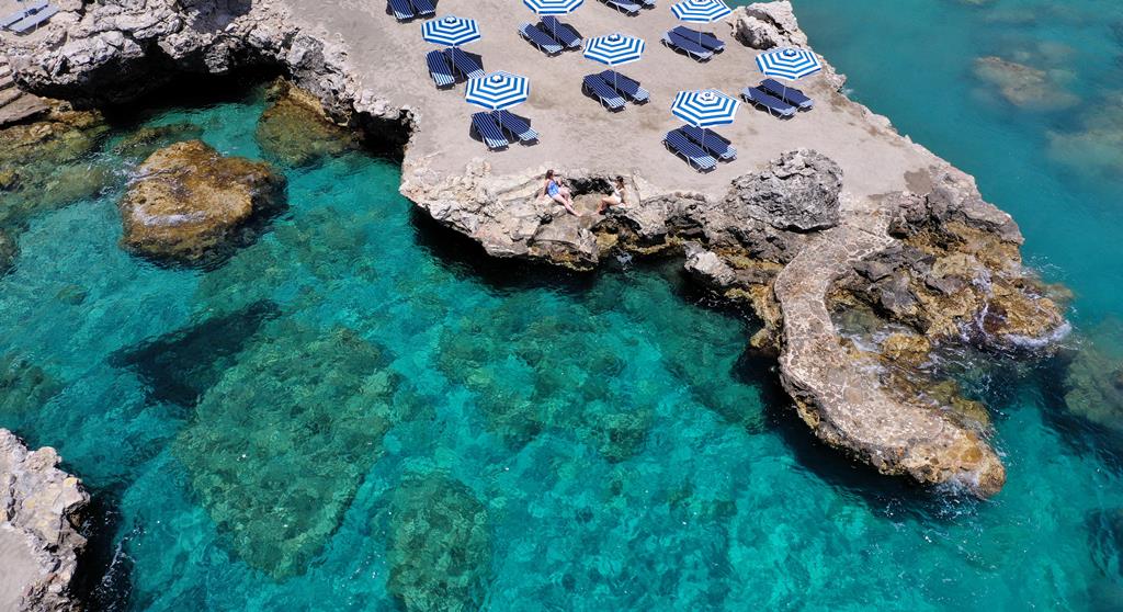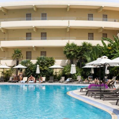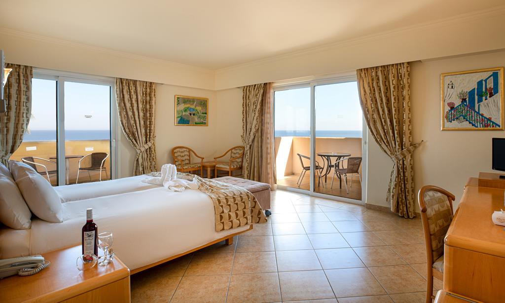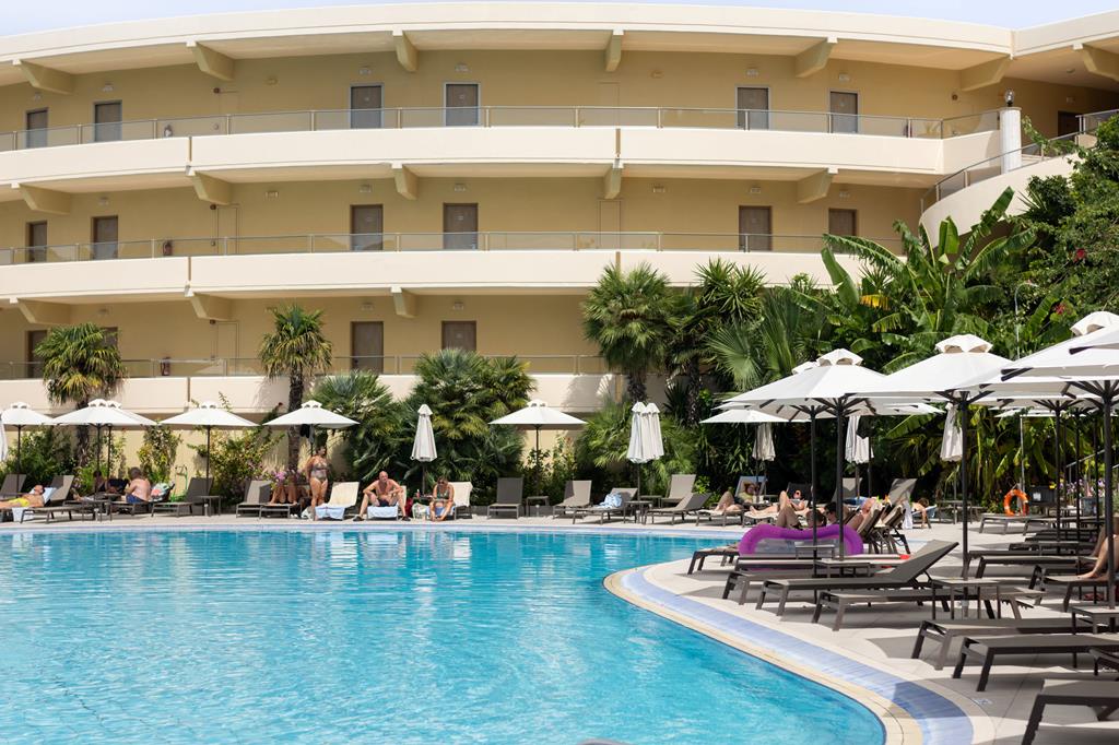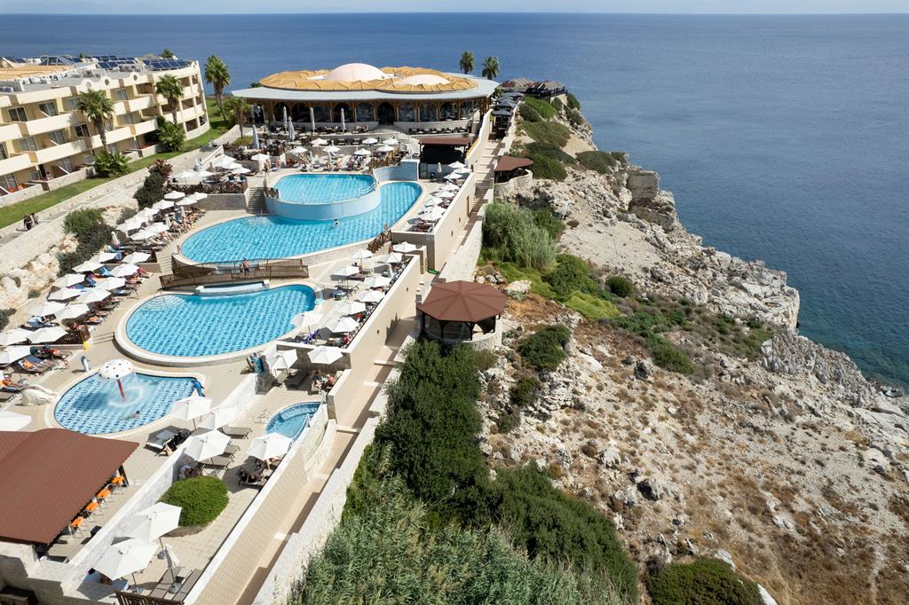 Drie ruime zwembaden, Plof direct op een ligbed, Verser eten op je bord kan niet, Kom tot rust in het bubbelbad, Panorama view over zee, Bij de mooie baai van Kalithea & inclusief transfers.