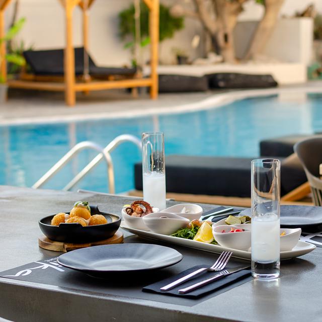 Bij het zwembad kun je heerlijk relaxen op een van de leuke ‘ligkussens’, met een drankje van de poolbar binnen handbereik. Ook is er een klein restaurant aanwezig met heerlijke gerechtjes voor elk moment van de dag.