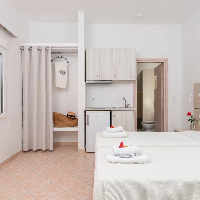 Bij Naftilos Rosmarinus geniet je van een ontspannen verblijf in een sfeervolle accommodatie. Je kamer heeft een eigen balkon of terras, met uitzicht op de tuin of de diepblauwe zee, perfect om je dag in alle rust te beginnen of af te sluiten.