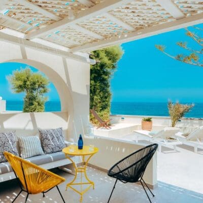 Wauw! Het kleinschalige Hotel Sigales ziet er zó sprookjesachtig uit. Het is helemaal in de stijl van de Cycladen gebouwd. Het stijlvolle plekje dat uit slechts 30 kamers bestaat, verdeeld over twee gebouwen bestaat, is wit met typerende blauwe details. Het ligt direct aan het zwarte, vulkanische strand van Kamari waar je kunt genieten van de kraakheldere zee. Het centrum van dit gezellige plaatsje is na een korte en gezellige wandeling te bereiken.