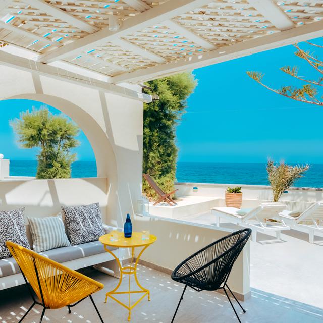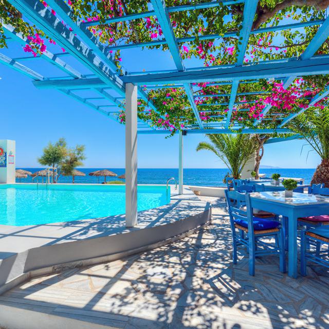 Ook de hotelkamer bestaat uit de typisch Griekse frisse witte en blauwe kleuren. De blauwe luikjes maken dit Griekse plaatje helemaal af. Wanneer je naar buiten stapt groeien op verschillende plekken kleurrijke bougainvilles. De roze bloemetjes steken prachtig af tegen de strakblauwe lucht. Bij de poolbar staan verkoelende drankjes en lekkere snacks op de kaart, bestel wat lekkers en kies een plekje aan het heerlijke zwembad uit.