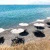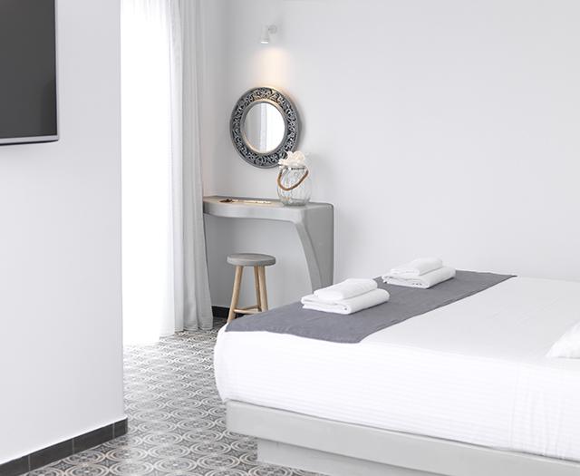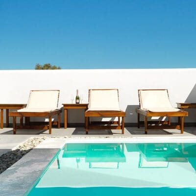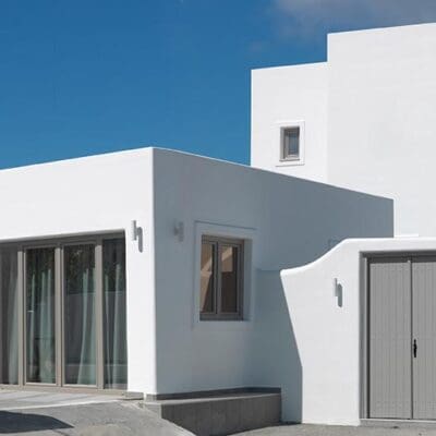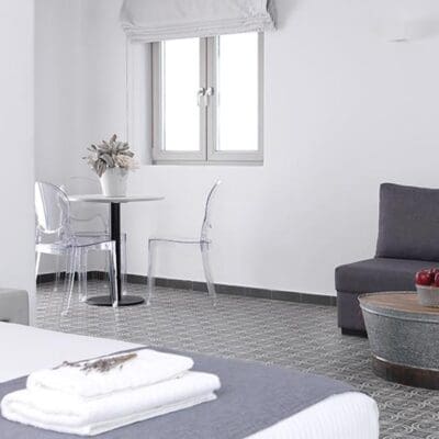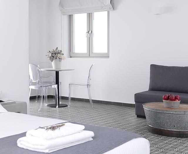 We stappen een van de villa's binnen en het eerste wat mij opvalt is het interieur. De inrichting is luxe en minimalistisch, met oog voor details. De rustige kleuren geven een koel gevoel aan de villa. “Er ligt nog wat lekkers voor je klaar”, zegt George met een knipoog wanneer hij wegloopt. Nieuwsgierig kijk ik rond en zie ik een heerlijke fles Griekse wijn staan. Dat maakt het plaatje compleet.