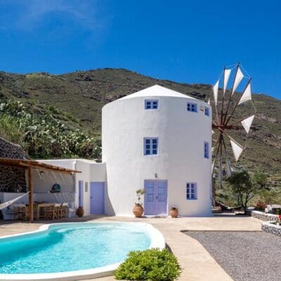 Verrukt kijk ik vanaf de weg naar mijn verblijf voor de komende dagen. Drie prachtige, wit geschilderde windmolens sieren de kust van Santorini. De vergezichten vanaf de villa's moeten wel fenomenaal zijn. Wanneer ik niet veel later neerstrijk op een van de ligbedden, word ik overvallen door de pracht van deze plek. Een privézwembad met jacuzzi in een tuin vol bloemen en een prachtig uitzicht over de blauwe, glinsterende zee. Ik geniet met volle teugen en ga snel naar binnen om mijn boodschappen van vanmiddag te halen. De molen is heel knus, bijna schattig te noemen. De pasteltinten en bloemetjes creëren een romantische sfeer. Buiten besluit ik me, met mijn glas witte wijn en Griekse mezes, in het zitje onder de pergola te installeren. De zon gaat langzaam onder en geeft de witte muren een oranje rode gloed. Ik neem een slokje, zak wat onderuit en besluit dat een dagje aan het zwembad morgen misschien helemaal niet zo'n gek idee is.