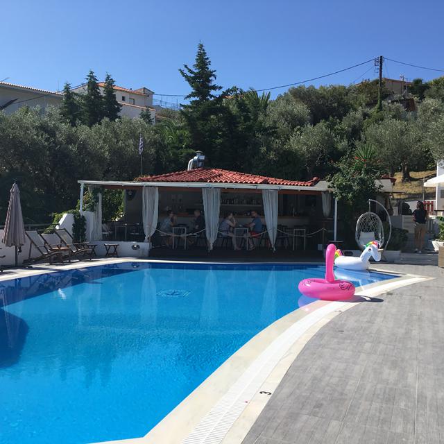 Appartementen Nicholas is een gezellig complex met een rustige ligging in Megali Ammos. Het bestaat uit verschillende gebouwtjes, waarin de ruime appartementen zijn gelegen. Deze zijn eenvoudig maar netjes ingericht. Vanaf het balkon van het hoogst gelegen gebouw heb je prachtig uitzicht over de zee en Skiathos-stad, dat op circa 10 minuten afstand ligt. In de lagere gebouwen kijk je uit op olijfbomen, het zwembad en een weelderige tuin. Aan het zwembad kun je ultiem relaxen in de Griekse zon. Voor een verfrissend drankje helpt de barman Arlenne je graag bij de poolbar. De huisgemaakte tonijnsalade bij de poolbar is een echte aanrader.
