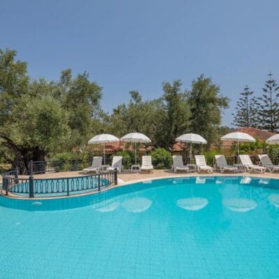 Tussen alle planten en bloemen door liggen de 4 gebouwen van Appartementen Villa Christina, waar het heerlijke zwembad absoluut een ideaal middelpunt van is. Ook is er een kleine kiosk waar ze, naast ijsjes en drankjes, lokale producten verkopen zoals wijn en olijfolie. Ook zijn er strandlakens, parasols voor op het strand en snorkelapparatuur allemaal te leen van de eigenaar;ideaal!