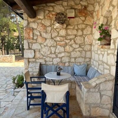 Tegen het einde van mijn vakantie op Zakynthos stuitte ik eigenlijk per ongeluk op het Aresti Mountain Resort van de familie Stamaris. Ik had die ochtend gesnorkeld bij een van de rotsbaaien van het eiland en was daarna in een restaurantje een hapje gaan eten. Ik had mijn drankje nog niet besteld of Fenia Stamaris kwam naast me zitten. Zij bleek eigenares te zijn van een groot landgoed verderop en wist me bovendien te vertellen dat zij niet alleen haar land zelf bewerkte, maar er ook een paar luxe villa’s verhuurde. En daar had ik natuurlijk wel oren naar!